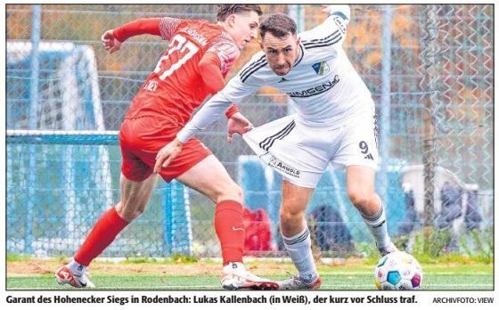 SV Rodenbach - TuS 04 Hohenecken 0:1. In einem guten Landesligaspiel boten die Gastgeber dem jetzt amtierenden Tabellenführer bis zum Schluss Paroli. Zwei starke Torhüter sorgten dafür, dass es lange torlos blieb und das Spiel so beinahe mit einer gerechten Punkteteilung geendet hätte. In den letzten Minuten der Partie sorgten jedoch ein Eckball und der darauffolgende Kopfball von Lukas Kallenbach (87.) doch noch für die Wende. Aus Rodenbacher Sicht nicht nur ärgerlich, weil man sich so für eine gute Leistung nicht belohnte, sondern auch, weil dem Eckball ein Foul am SVR-Schlussmann Constantin Levy voranging. Zuvor schon wurde ein möglicher Handelfmeter für die Heimelf nicht gegeben, wie es aus Rodenbach hieß. Für die Gäste bedeutet der Sieg derweil den ersehnten Sprung an die Tabellenspitze. nali